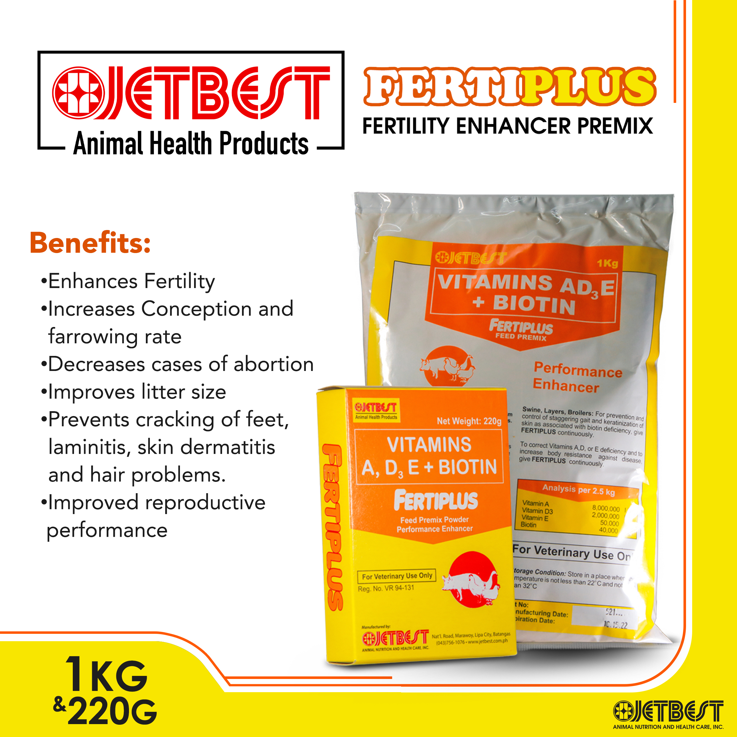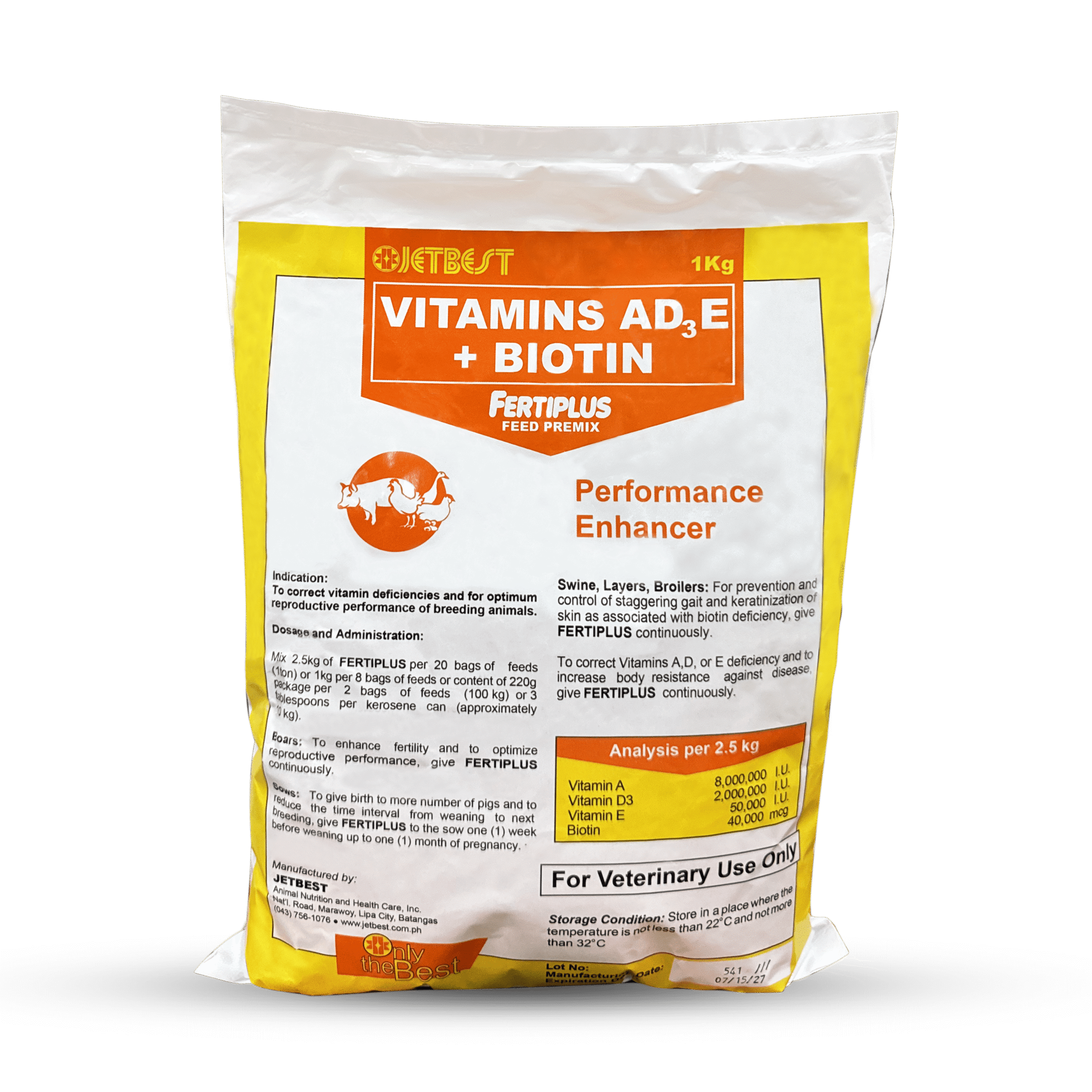 FertiPlus is a fertility enhancer premix for livestock and poultry animals. FertiPlus has Vitamins A, D, E and Biotin that give animals the advantage of optimum reproductive performance. It helps with increasing animals’ libido; retention of nutrients for bone deposition of calcium and phosphorus, regulate the development and function of gonads and aids in preventing cracking of feet and hoof horn.